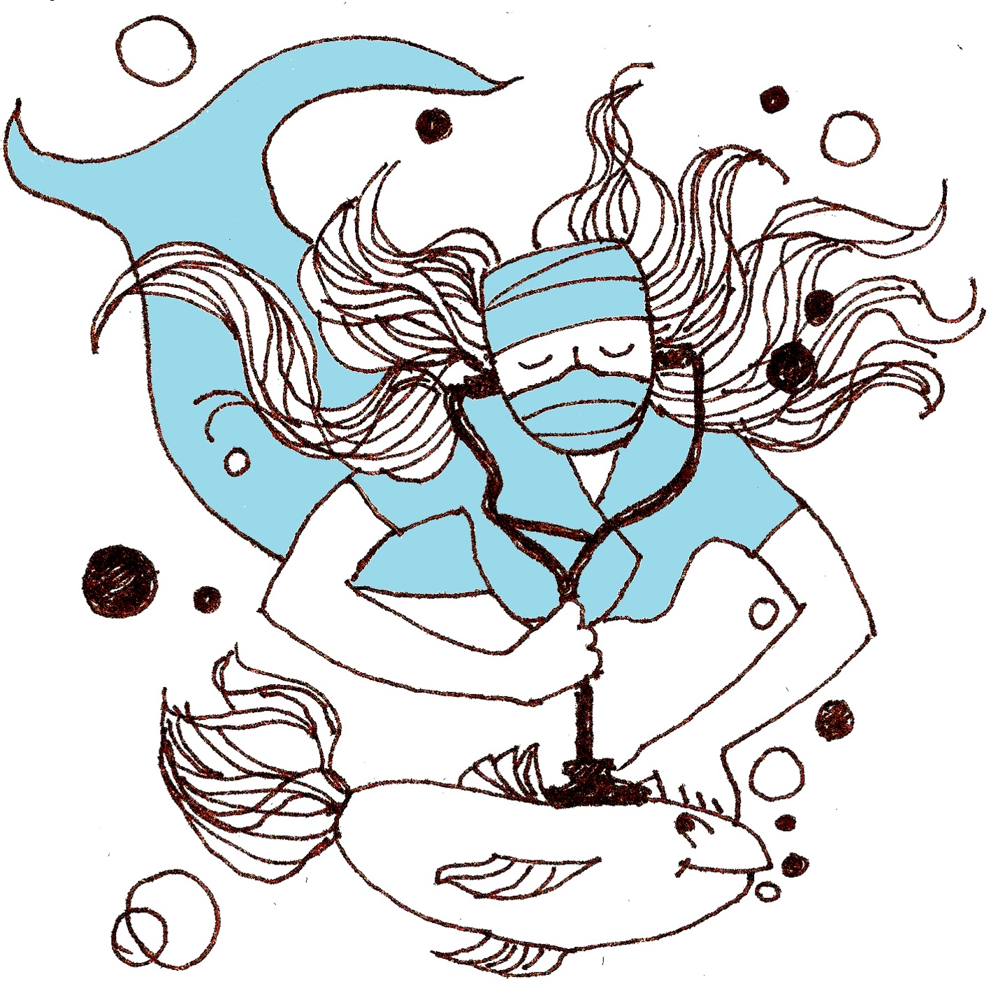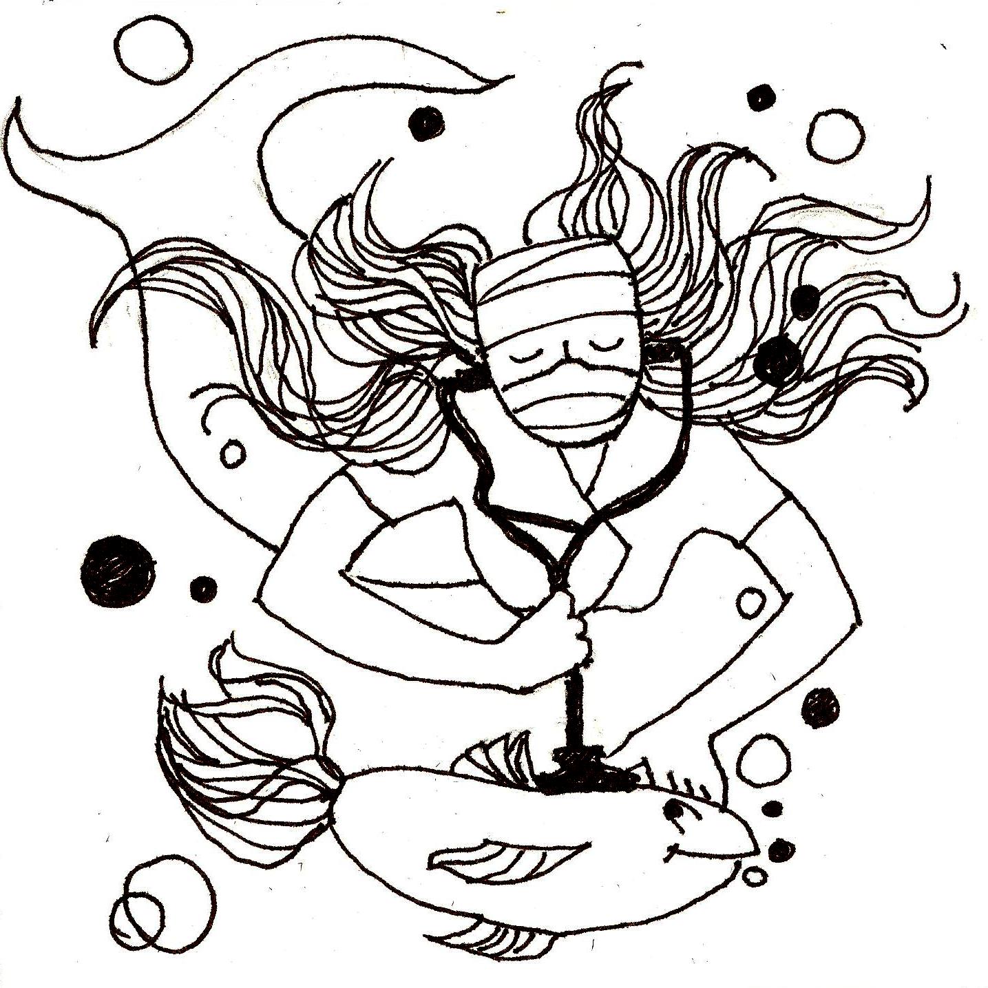 Yes, that is me and my stethoscope underwater working on a fish. This is how Connie saw my job in her creative mind. I absolutely love this design. Now, add some color, and voila!